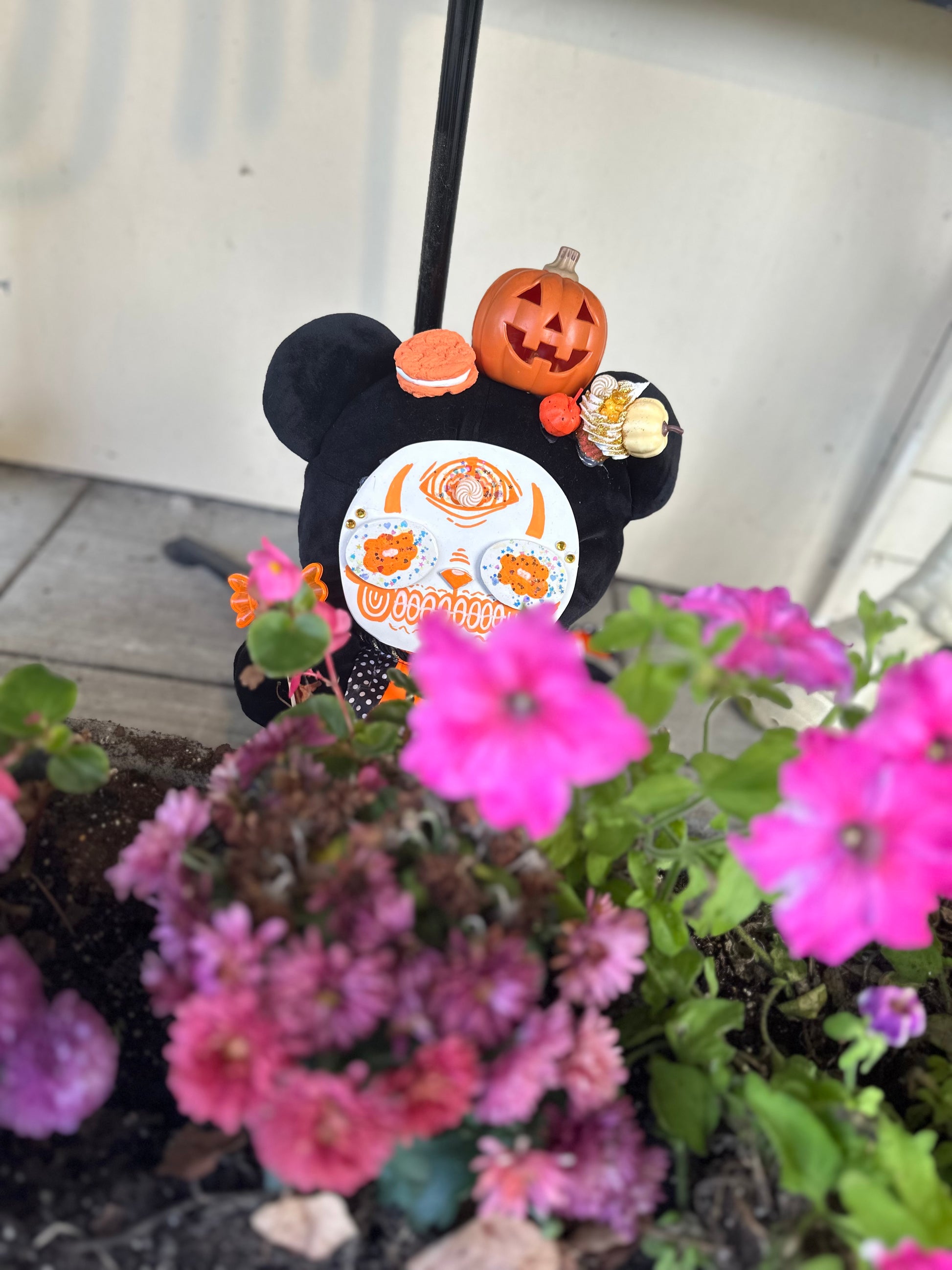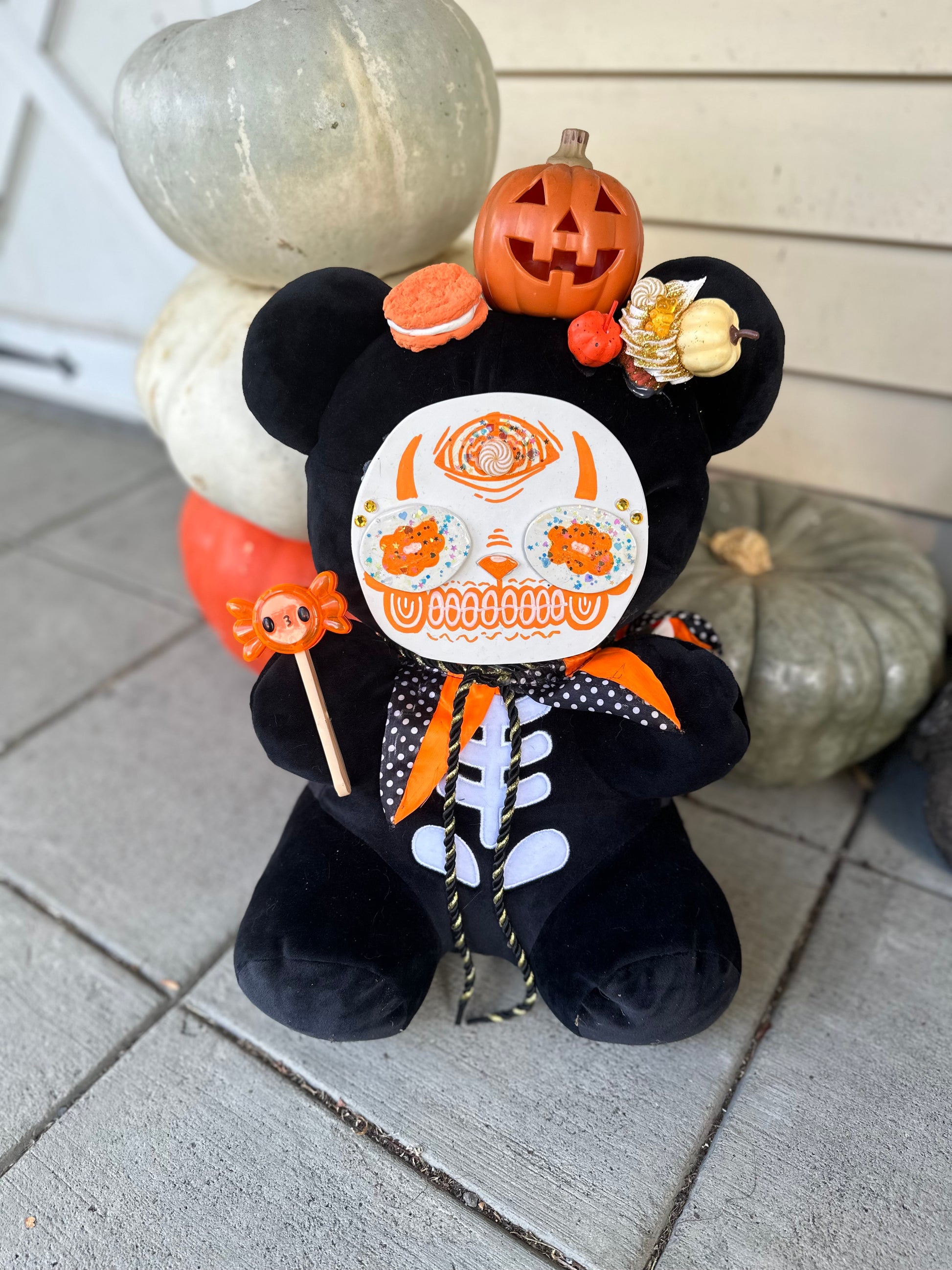 This is a repurposed teddy bear into a custom piece of art. It has one off clay face. It's 18 inches tall including the hat & 10 inched wide. These are not toys or meant to be played with. Decor purpose only!!